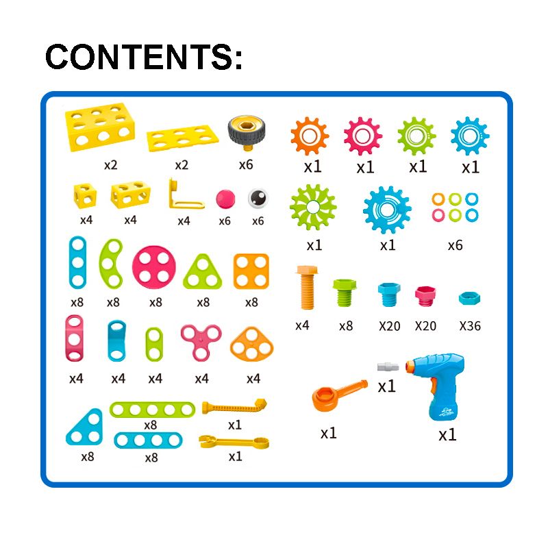 set comes complete with a toy drill, screwdriver/wrench, nuts, bolts and many